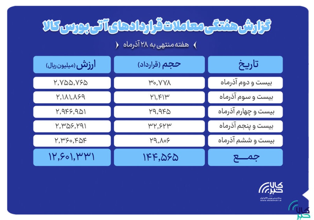 در هفته گذشته 144هزار و 565 قرارداد آتی به ارزش هزار و 260 میلیارد تومان منعقد شد. بیشترین حجم و ارزش معاملات نیز به روز 24 آذرماه اختصاص یافت به طوری که در این روز 29هزار و 945 قرارداد به ارزش بیش از 294 میلیارد تومان منعقد شد.